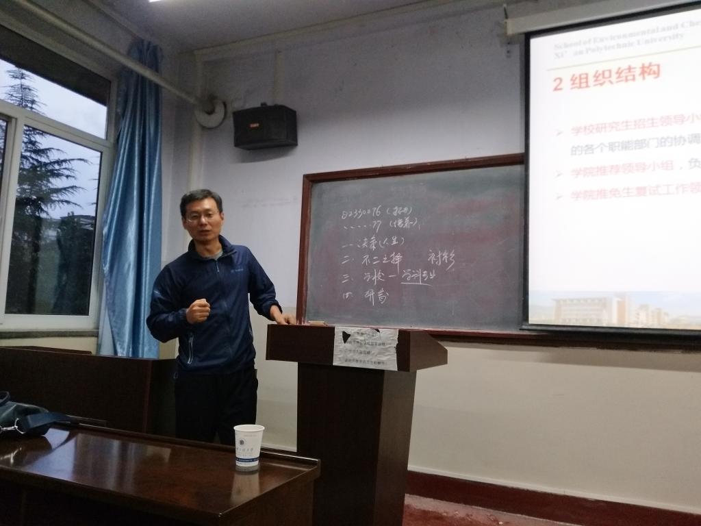 刘晓喆老师指出大四是人生抉择的重要时刻,考研是每一个大学生人生的重要选择。随后,他详细介绍了近几年我校研究生教育在顶层设计、规范教育教学、学科和专业建设等方面的成果。最后他阐述了报考我校研究生的优势,并欢迎环化学院优秀毕业生积极报考我校研究生。