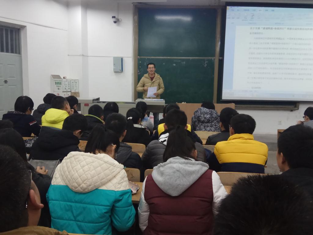 12月26日19点,环化学院在临潼校区B-135举办了“感谢师恩•你我同行”寒假公益动员大会,参加大会的有团学科主要干部以及16级全体学生,本次会议由王春元主持。