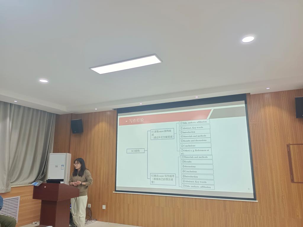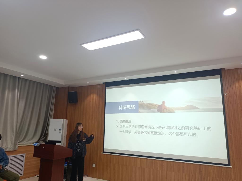 接着,今年研究生国家奖学金获得者杨青、陈景茹、李丹分享了他们的学习科研经验。杨青鼓励同学们要多看高质量英文文献,并展示了文献阅读技巧和文献检索途径,为后续论文撰写打基础。陈景茹指出,论文的选题要尽量与导师的研究方向和自己感兴趣的方面进行选题,当遇到科研问题可以请教比较方便的导师以及师兄师姐。李丹介绍了如何通过分区和影响因子检索论文,并分享了自己在论文投稿过程的心得。