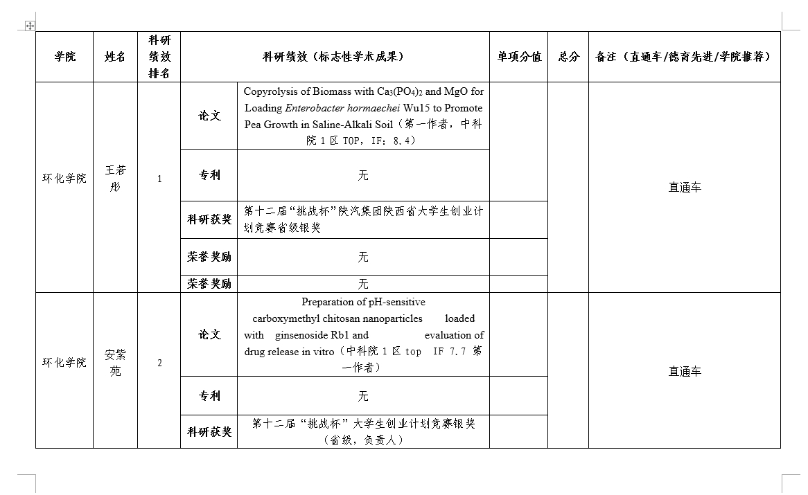 研究生国家奖学金评审办法》及《关于开展2024年硕士研究生国家奖学金评审工作的通知》的相关要求,本着公平、公正、公开的原则,经学生本人申请,学院学生工作领导小组初审,学院国家奖学金评审小组审核推荐等程序,拟推荐王若彤、安紫苑两位同学作为研究生国家奖学金直通车推荐人选,任雅静、宋振阳、李雅馨、吴诗瑶、岳骏松五位同学作为2023-2024学年研究生国家奖学金竞争性推荐人选,具体名单如下。