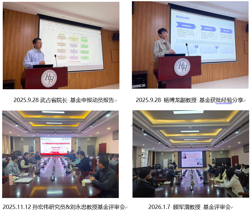 学院于2025年9月28日召开基金动员大会,院长武占省教授作动员报告,由学院近年获批基金的教师分享经验,激发青年教师申报热情。此后及寒假期间,学院密集组织了11次基金申报辅导报告会、基金评审会。邀请来自西安交通大学、西北工业大学、陕西师范大学、西安理工大学、暨南大学、武汉大学、华中农业大学、中国石油大学(华东)、中国科学院化学研究所等单位的知名专家来院交流。其中,西北工业大学顾军渭教授(国家万人)、暨南大学朱明山教授(国家优青)、西安理工大学李喜飞教授(国家领军人才)等高水平专家,分别从选题思路、申请书撰写、科学问题凝练等方面给予细致辅导,并针对2026年度国家基金自然科学基金项目新版指南,分享应对策略。