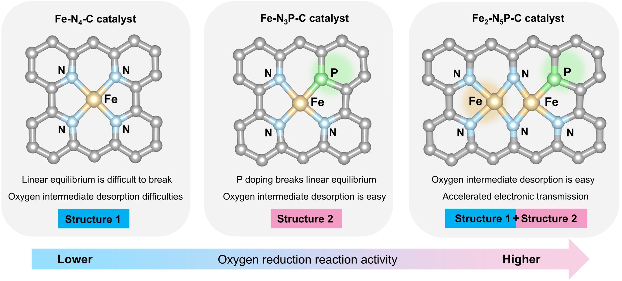 如果说单原子调控是“精雕细琢”,那么双原子协同则是“强强联合”。团队构建P掺杂双核Fe位点催化剂(Fe2N5P-HPC)。双Fe原子与P原子形成协同效应,诱导电子结构再分配,有效活化O-O键并加速关键中间体脱附。该催化剂半波电位高达0.906 V,组装的锌空电池循环寿命突破500小时,为双原子催化剂设计提供新范式。相关成果发表在J. Mater. Sci. Technol. 2026, 261, 265–273上(中科院一区TOP,IF=14.3)。