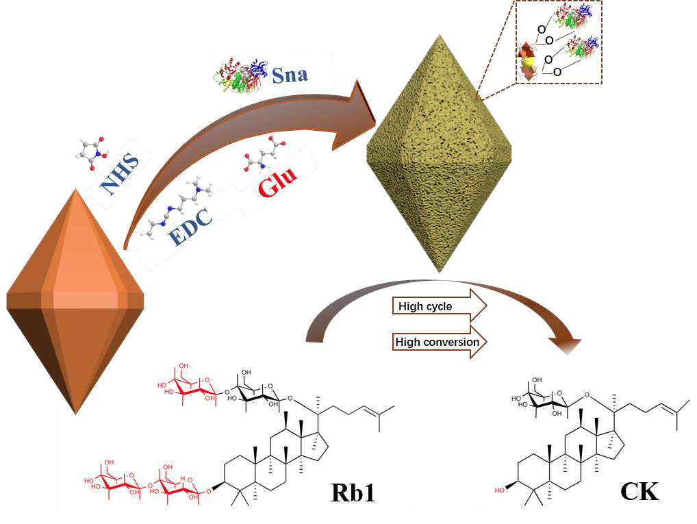 在生物催化体系构建与性能强化方面,课题组围绕酶催化过程中稳定性不足与难以重复利用等关键问题,开展了基于功能化金属有机框架材料的固定化策略研究。通过引入天然谷氨酸对铁基金属有机框架材料MIL-88B (Fe)进行表面修饰,构建新型复合载体体系,并结合共价接枝方法实现酶分子的高效固定化。该研究创新性地利用有机配体调控载体界面化学环境与空间结构,有效改善了酶分子微环境与构象稳定性,克服了传统游离酶体系在工业应用中的局限性,为稀有人参皂苷CK的绿色高效制备提供了重要技术路径。研究成果以“Immobilization of snailase on glutamate modified MIL-88B(Fe) to efficiently convert the rare ginsenoside CK with high enzyme recyclability and stability”为题发表于国际期刊《International Journal of Biological Macromolecules》(中科院一区TOP,IF 7.7),曹翠博士为第一作者,武占省教授为通讯作者,明日影视