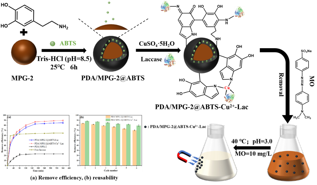 为进一步提升酶载量,采用盐酸多巴胺(PDA)作为界面功能分子,利用其强黏附性和丰富的官能团,对MPG-2进行表面涂层修饰,并实现了介体ABTS与漆酶的共固定化。所构建的固定化体系PDA/MPG-2@ABTS-Lac和PDA/MPG-2@ABTS-Cu²⁺-Lac均表现出高载酶量(分别为62.1 mg/g和61.3 mg/g)和高活性回收率(分别为107.9%和135.1%)。在模拟废水降解实验中,两种体系均能在3小时内实现85%以上的甲基橙去除率。此外,固定化酶在高温、宽pH范围以及多次循环催化过程中均表现出优异的稳定性,显示出在实际废水处理应用中的巨大潜力。本研究为开发高效、稳定的酶基水净化材料提供了新的策略和技术基础。研究成果以“Cu²⁺-Enhanced Magnetic Mediator–Laccase Co-Immobilized System for Efficient Methyl Orange Degradation in Wastewater”为题发表于国际期刊《Journal of water process engineering》,潘虹老师为第一作者,生物化工专业2023级研究生戴宜轩为第二作者,王晓军老师为通讯作者,明日影视