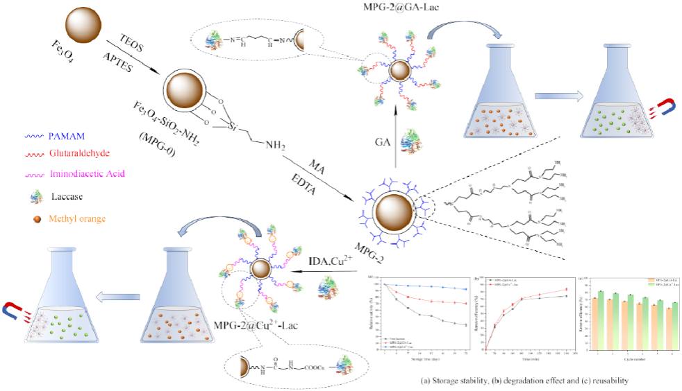 在传统的染料废水处理中,甲基橙作为典型的难降解有机污染物,一直是治理的重点与难点。虽然漆酶作为一种绿色催化剂在染料脱色方面潜力巨大,但游离漆酶稳定性差、难以回收的弊端长期制约着其工业化应用。针对这一瓶颈,王晓军副教授、潘虹博士团队以四氧化三铁为核,通过在其表面修饰超支化聚酰胺-胺树状大分子,创新性地构建了一种新型磁性树状大分子,并通过不同方法制备了两种固定化漆酶,用于甲基橙染料的去除。发现6次循环操作后仍能保持固定化漆酶仍能保持66.18%的甲基橙去除效率。研究成果以“Preparation of Magnetic Dendrimer and Immobilization of Laccase for Methyl Orange Dye Removal”为题发表于国际期刊《BioNanoScience》,材料与化工专业2022级研究生陆天炆为第一作者,潘虹老师为通讯作者,明日影视