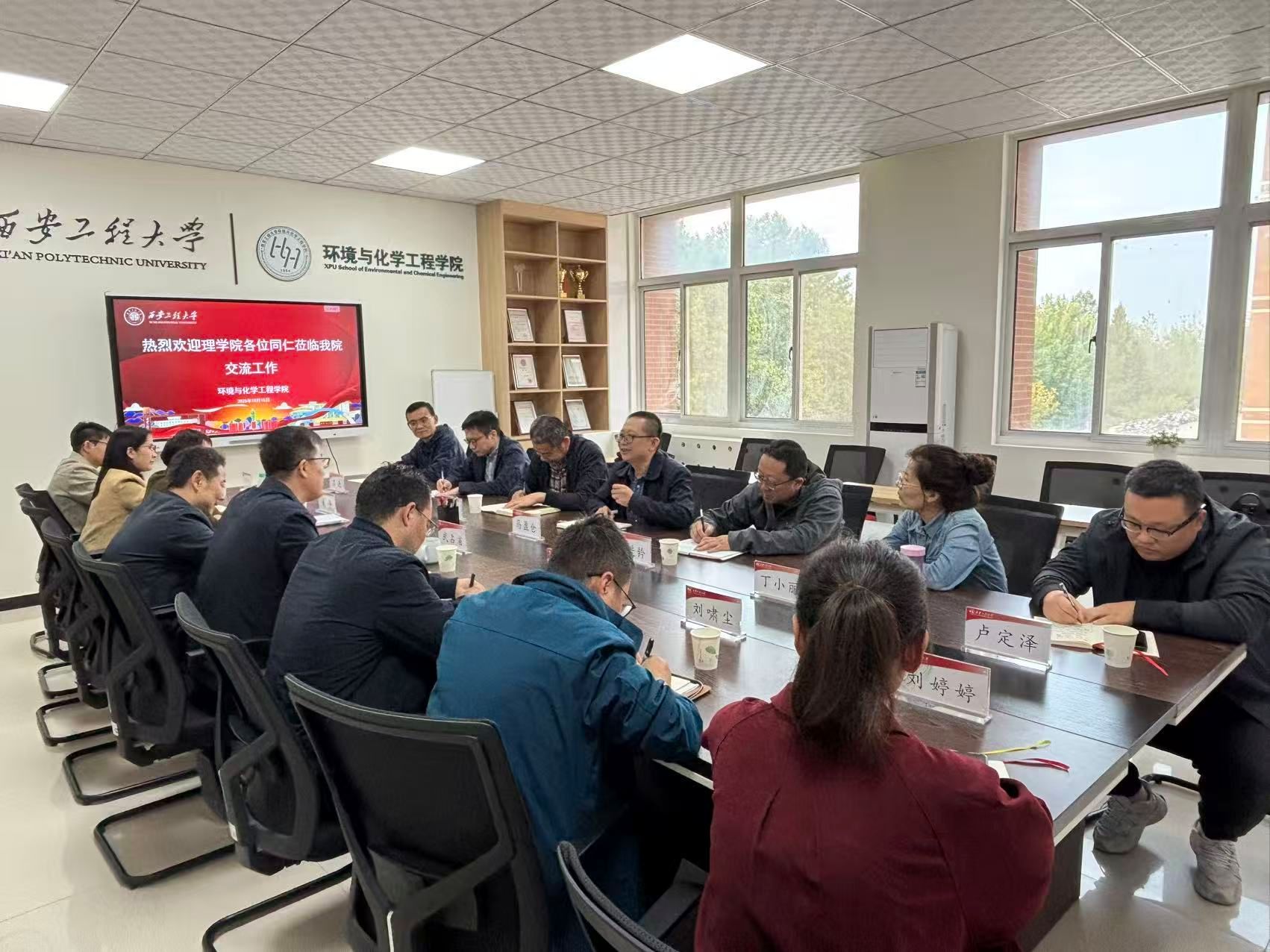 武占省院长对理学院一行的到访表示热烈欢迎,并详细介绍了学院的发展历程、学科建设成果及人才培养特色等情况,重点介绍了学院科研方向、团队建设、学术交流等方面的工作经验。马盈仓院长对学院的热情安排表示感谢,并介绍了理学院学科布局、师资力量和发展现状等情况。他表示,环化学院在科研创新和人才培养方面积累了丰富经验,此次交流旨在学习借鉴先进做法,加强交流合作。